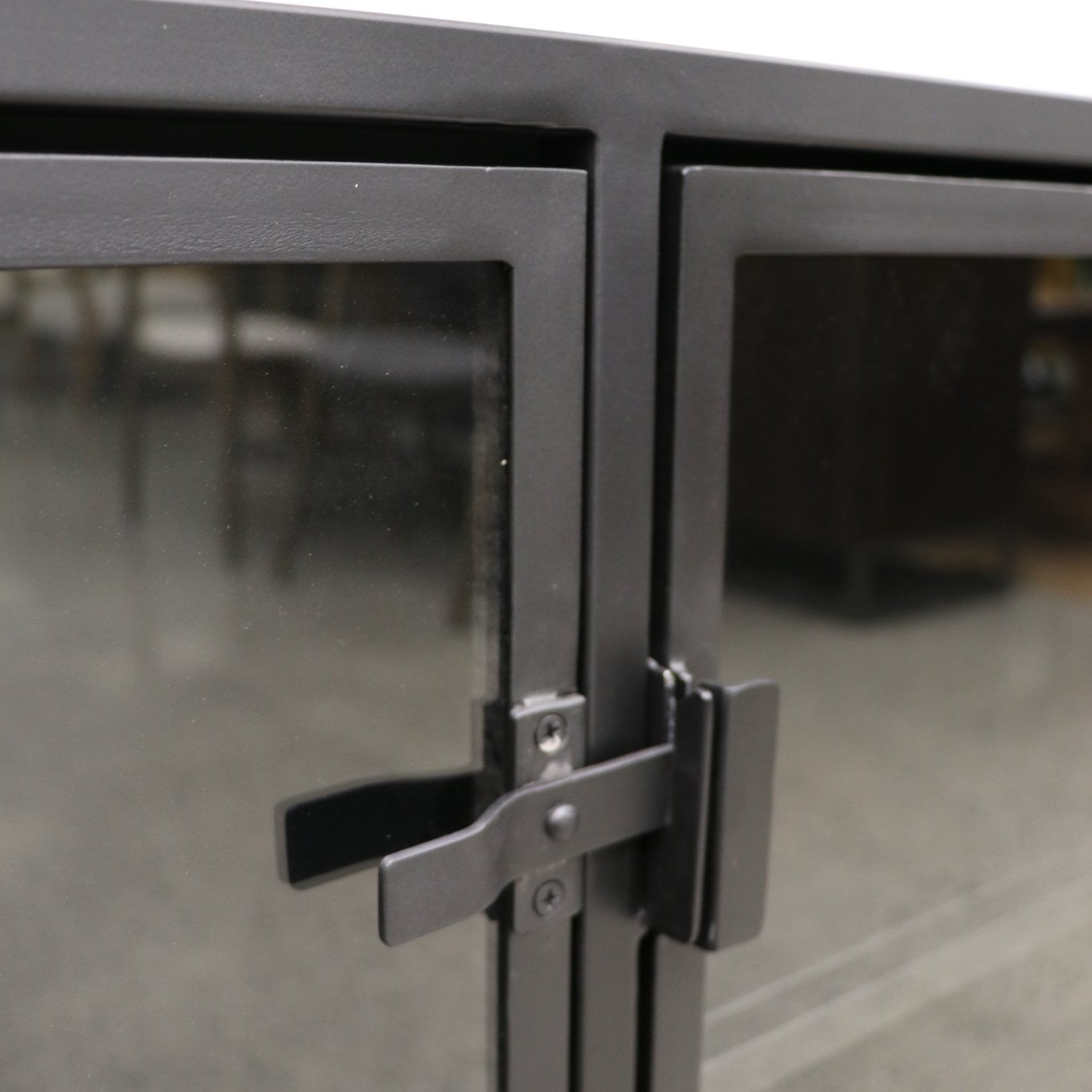 With its two easy-glide drawers and two tiers of shelving behind double glass doors that fasten with small iron latches, the unit is perfect for lounge, dining, entranceway display, or even as a bar.