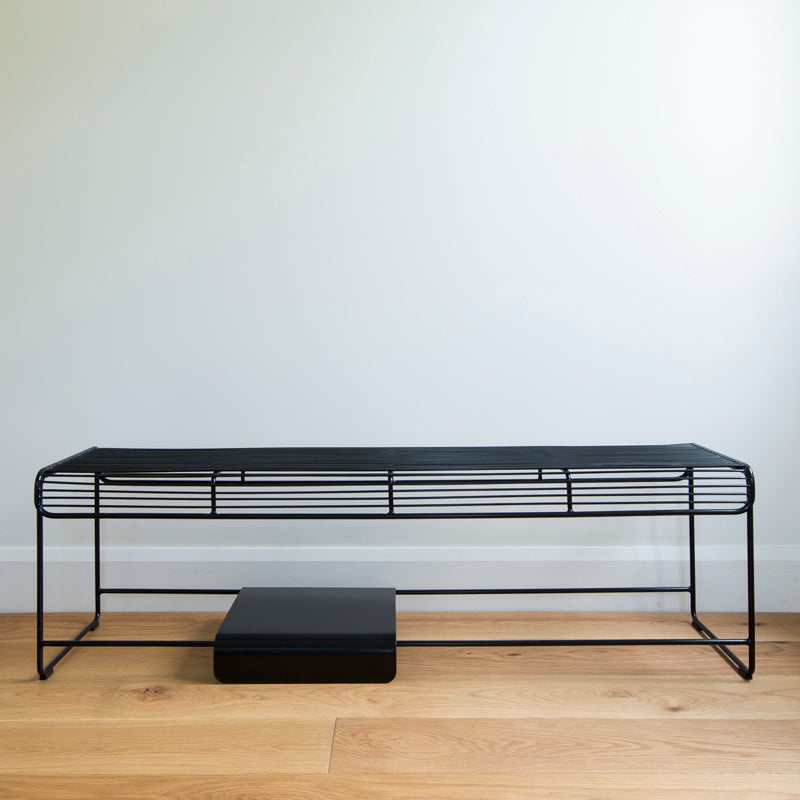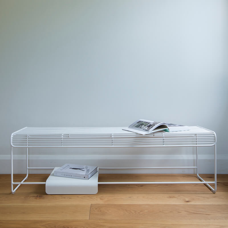 An additional design feature of a moveable solid metal plate creates multifunctional options. Sit the plate on top of the wire seat to create a stable place to sit cups & glasses. Place the plate on the bottom rungs to create a space to hold shoes, books, & plants, or remove completely for a sleeker look.