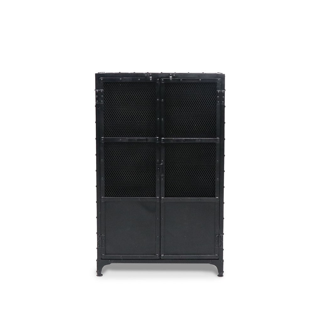 A mid-height double door industrial style cabinet/locker with exposed rivets, 3 tiers of shelving and mesh front cupboard doors - a perfect and unique storage piece.Ā