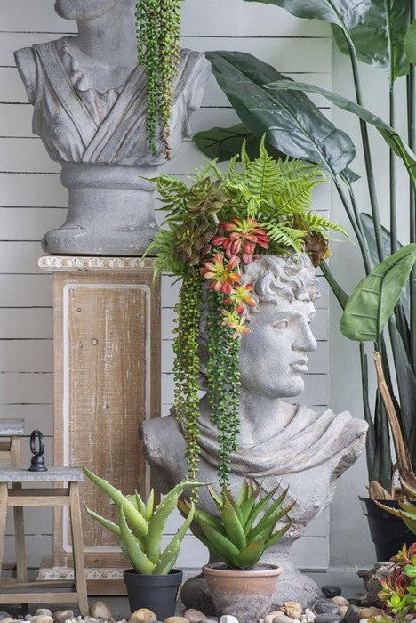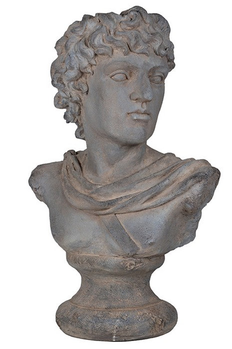 With his detailed curls and draped cape, this greek god statue brings classic greek sculpture into the 21st century. With its intricate details and aged grey colouring, this statue has the look of an antique, but with the durability of modern construction. A dignified accent for gardens natural or formal.