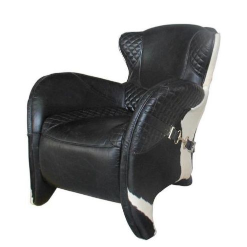The rodeo single chair in black with a cow skin back. Inspired by saddlery and crafted from highest quality top grain leather, this armchair will make a statement and add comfort to any living area, office, or entertainment area.