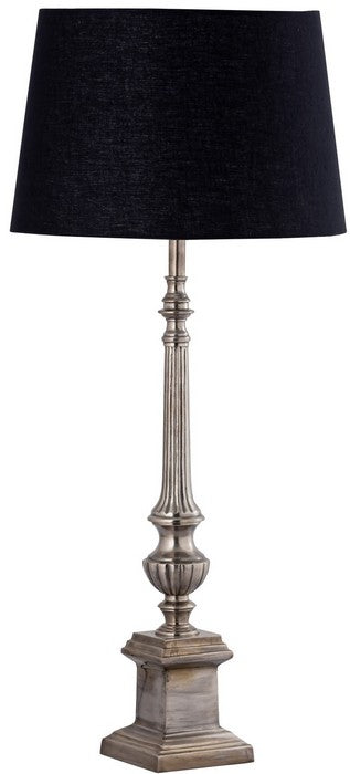Quality designed to last, and with a play on architectural design with the silver antique base and black cotton shade, this sturdy and contrasting table lamp would suit any space that needs soft illumination through a fabric shade.