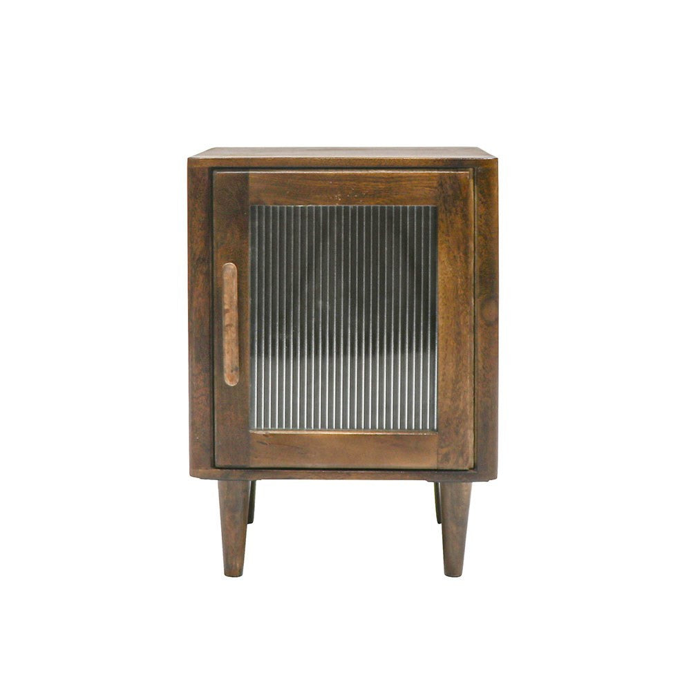 A stunning single door, bedside cabinet featuring beautiful reeded glass, which creates a beautiful corrugated texture, delivering a retro yet contemporary vibe. Crafted using Mango Wood.
